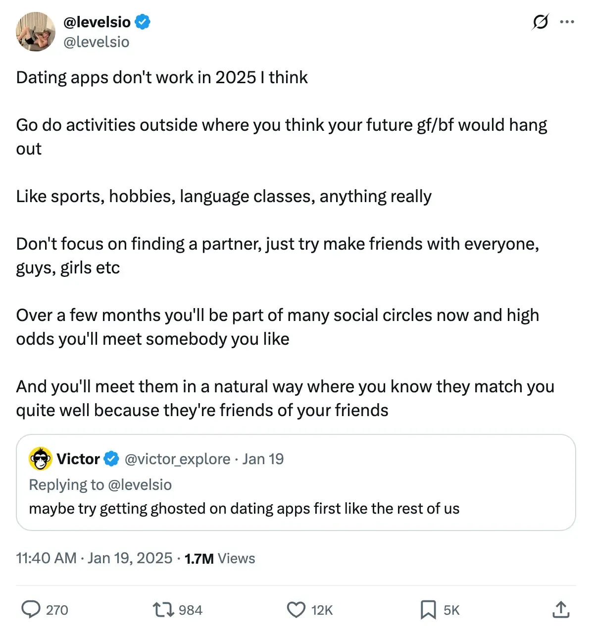 As funny as it is, if you truly want to find your life partner, you need to be maximising your exposure in real life. Go to meetups, find your third space, find your people. Naturally the world will gift you when you’re doing cool stuff. You can just do things.